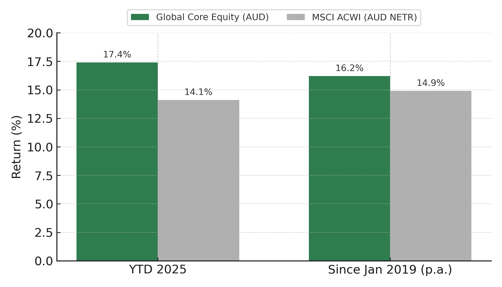 — +17.4% year-to-date, versus +14.1% for the MSCI ACWI AUD NETR.