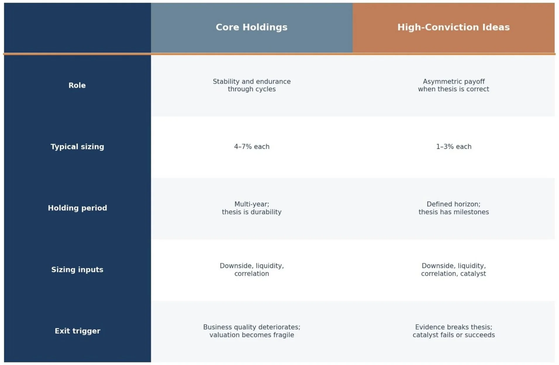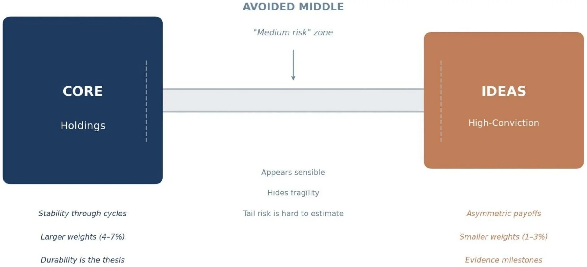 The barbell, in this sense, is how risk-first thinking manifests in portfolio structure. The principle that downside sets size applies to both ends of the barbell. Core and ideas are sized using the same logic: downside, liquidity, and correlation. What differs is the typical range and the holding period, not the discipline.