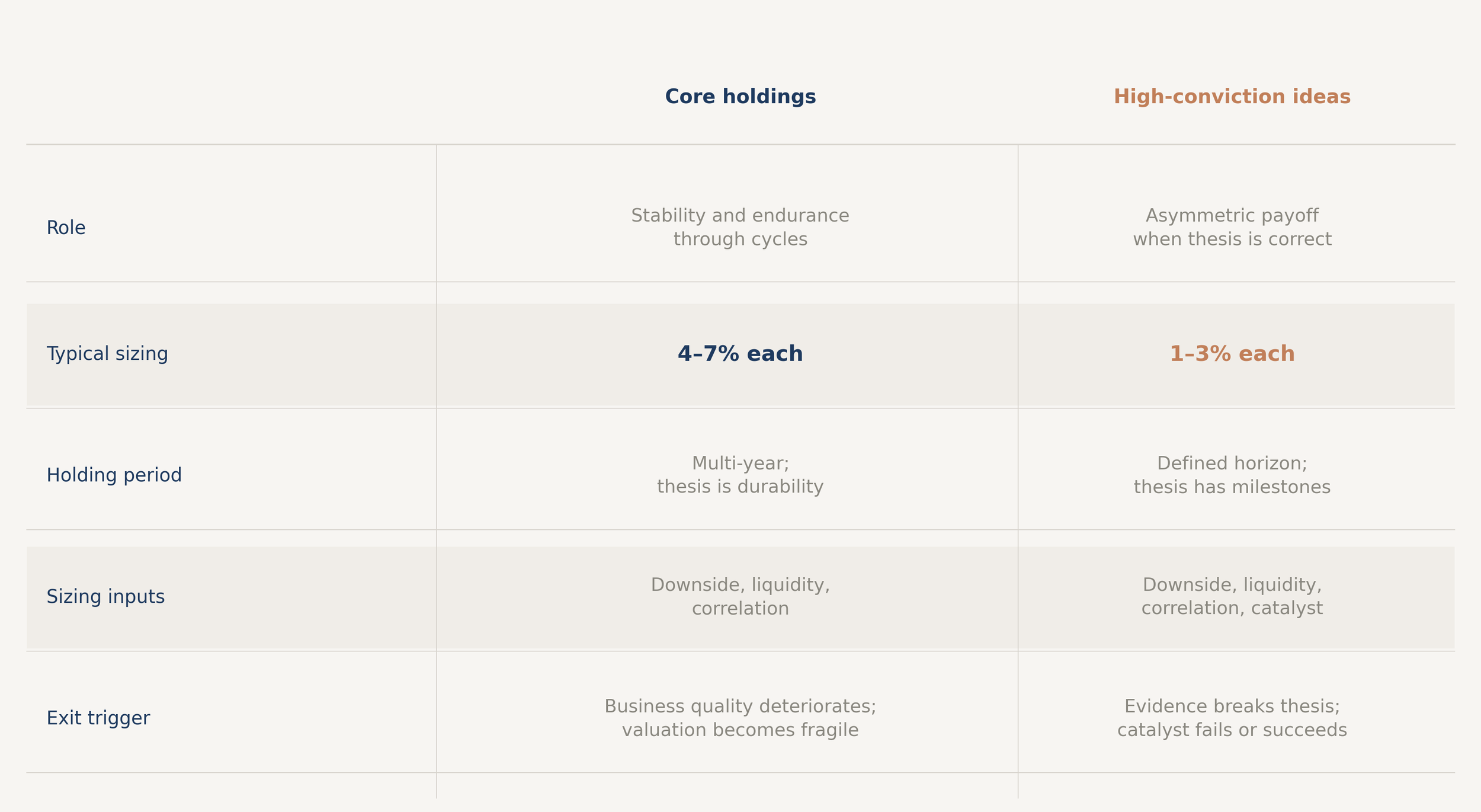 A durable core provides the stability that allows a portfolio to remain invested through stress. A smaller allocation to high-conviction ideas provides the asymmetry that moves the needle when the research is right. Neither works alone. Core without ideas compounds slowly while the world changes around it. Ideas without core become concentrated bets with no margin for error. The barbell is what allows both to coexist.