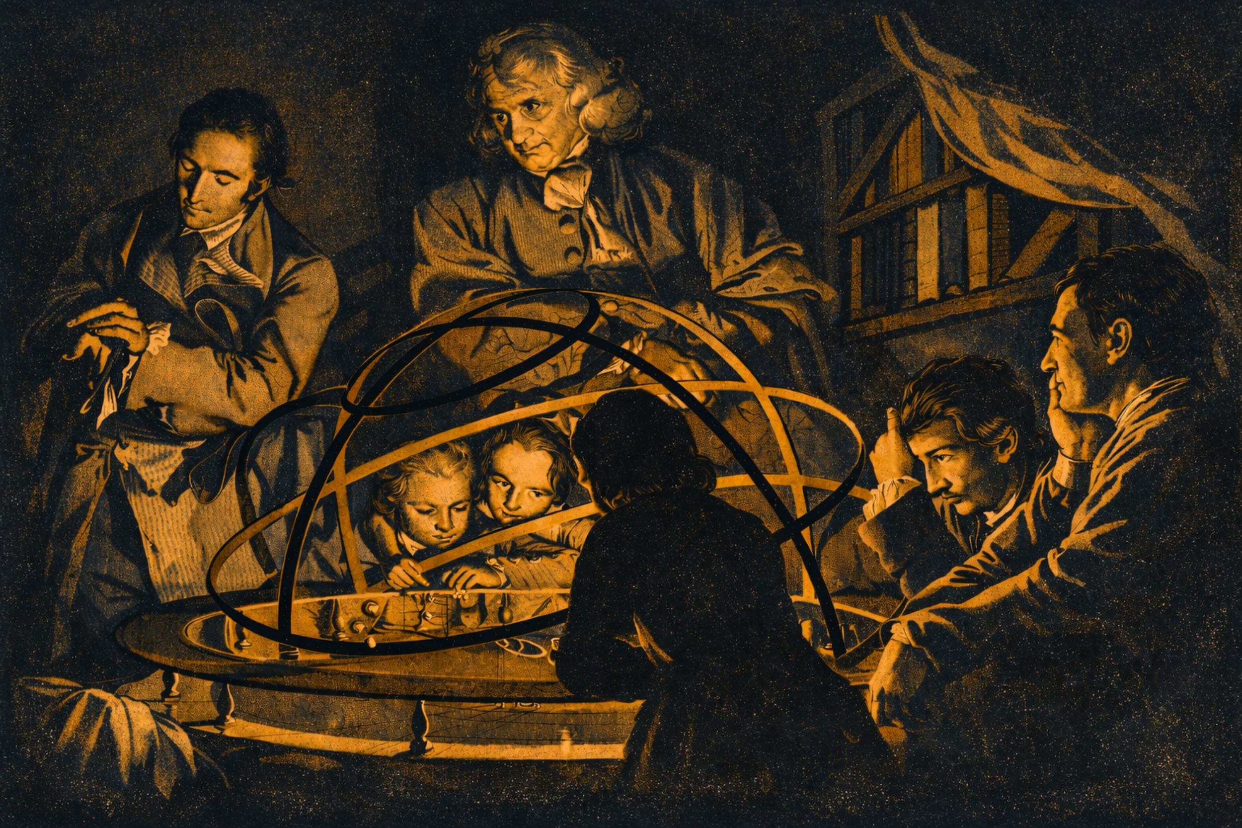 The paths of the bodies inside this instrument were fixed before the demonstration began: mass, distance, and the laws that govern both. Joseph Wright of Derby, A Philosopher Giving a Lecture on the Orrery, 1766. Derby Museum and Art Gallery. Cropped, redrawn, and colour-treated.
